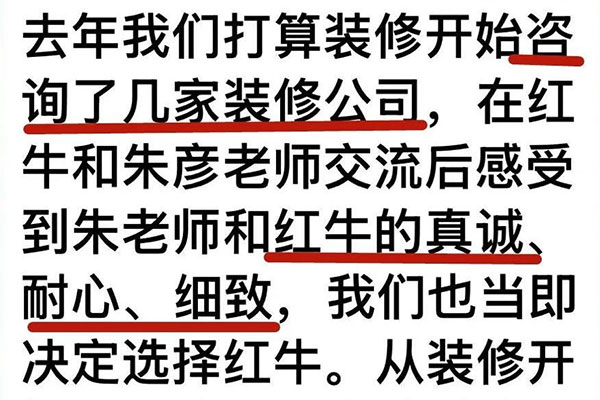 這次有幸與紅牛裝飾公司合作裝修房子,使我深受感動(dòng)!在這三個(gè)月的裝修時(shí)間里,設(shè)計(jì)師顧娟,項(xiàng)目經(jīng)理王志堅(jiān),工程監(jiān)理宋昕,三位老師給我留下了良好而又深刻的印象。設(shè)計(jì)師顧娟工作責(zé)任心強(qiáng),對項(xiàng)目管理嚴(yán)格,以身作則模范帶頭作用好,服務(wù)耐心,熱情,工作標(biāo)準(zhǔn)高。工程監(jiān)理宋昕業(yè)務(wù)能力強(qiáng),作風(fēng)深入扎實(shí),對質(zhì)量要求嚴(yán)格,工作深入扎實(shí),很好地為施工質(zhì)量把了關(guān)。在三位的帶領(lǐng)下,工程隊(duì)的師傅們以高度負(fù)責(zé)的精神保質(zhì)保量高標(biāo)準(zhǔn)地完成了任務(wù)。在這里,我感謝紅牛裝飾公司的領(lǐng)導(dǎo)!更感謝戰(zhàn)斗一線的領(lǐng)導(dǎo)和工人師傅們!